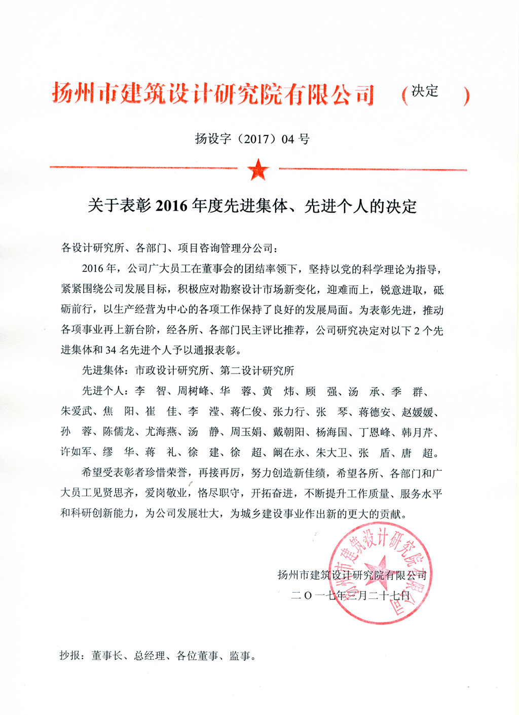 關于表彰2016年度先進集體、先進個人的決定